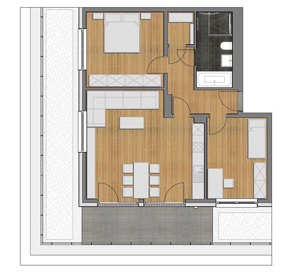 Jede Wohnung überzeugt durch eine durchdachte Architektur, helle Räume und großzügige Balkone, Terrassen oder Dachterrassen, die den Wohnraum ins Freie erweitern. Die Ausstattung lässt keine Wünsche offen: Eichenholzparkett, Fußbodenheizung und moderne Bäder sorgen für eine behagliche Atmosphäre. Die energieeffiziente Luft-Wasser-Wärmepumpe garantiert niedrige Nebenkosten – das Quartier erreicht die Energieklasse A+.