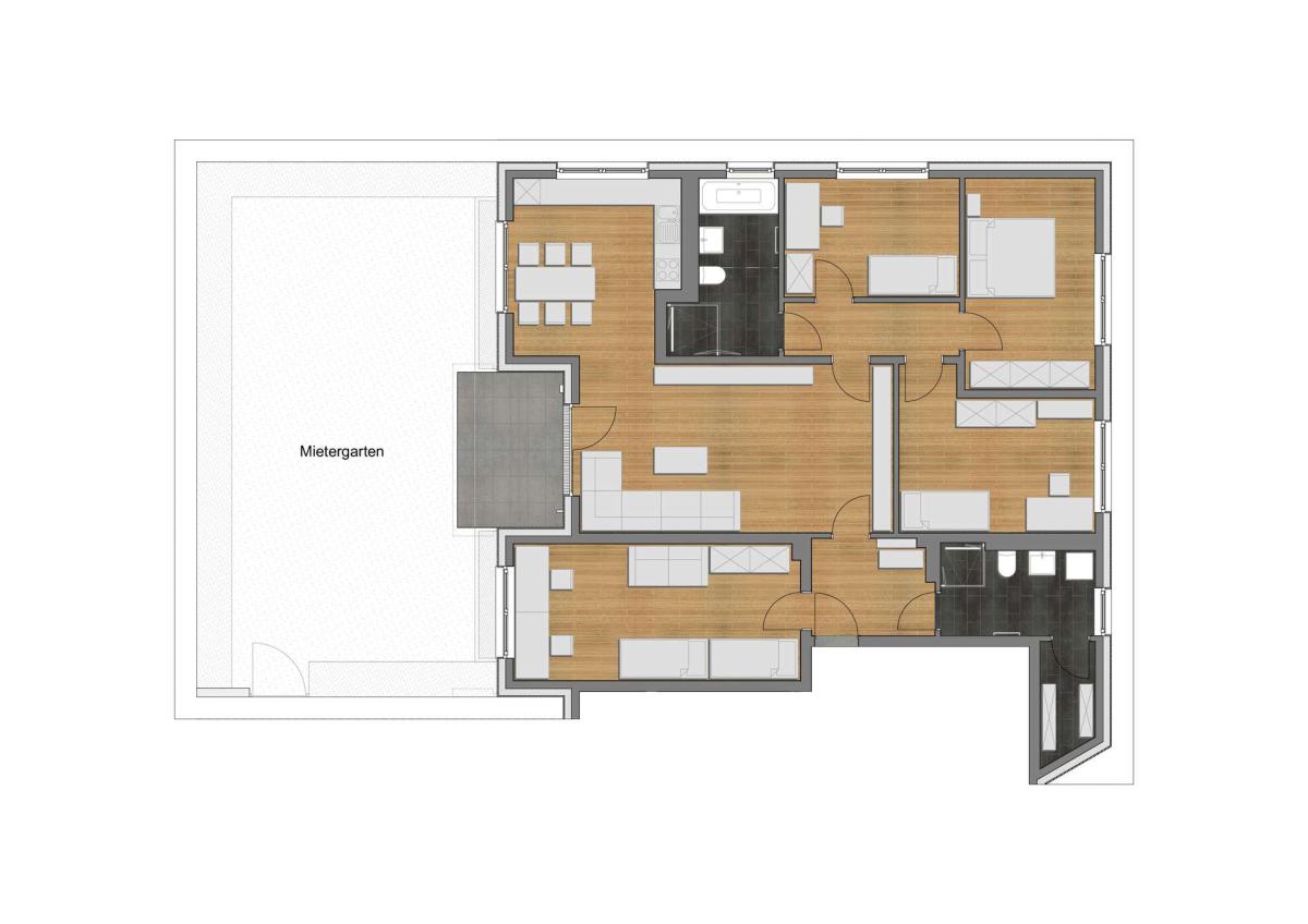 Jede Wohnung überzeugt durch eine durchdachte Architektur, helle Räume und großzügige Balkone, Terrassen oder Dachterrassen, die den Wohnraum ins Freie erweitern. Die Ausstattung lässt keine Wünsche offen: Eichenholzparkett, Fußbodenheizung und moderne Bäder sorgen für eine behagliche Atmosphäre. Die energieeffiziente Luft-Wasser-Wärmepumpe garantiert niedrige Nebenkosten – das Quartier erreicht die Energieklasse A+.