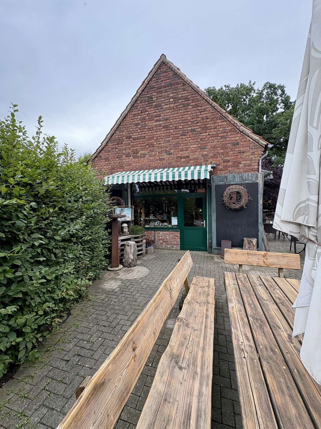Außengastronomie: einladender Außenbereich mit Sitzplätzen im Grünen, beliebter Treffpunkt in der Region