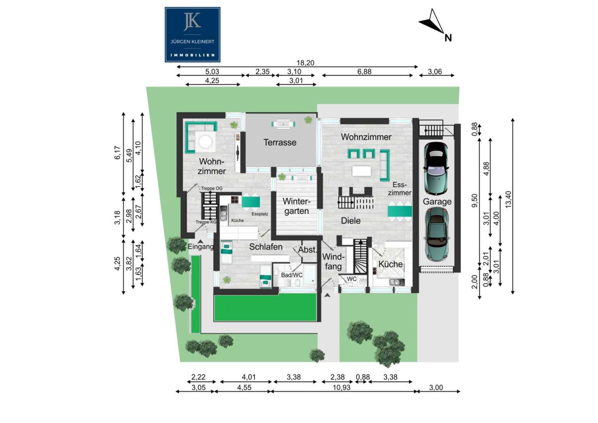 Direkt am Eingang des Einfamilienhauses befindet sich die große Garage (11 m) und 2 PKW-Einstellplätze.