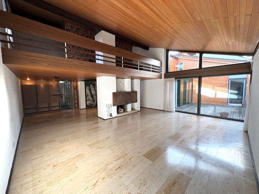 Einfamilienhaus (1971) mit Erdgeschoss, Obergeschoss und Empore mit ca. 195 m² insgesamt und aufgeteilt auf Wohnzimmer, 4 Schlafzimmer, 2 Bäder, Küche, Gäste-WC, Flur, Wintergarten und Esszimmer sowie Terrasse.