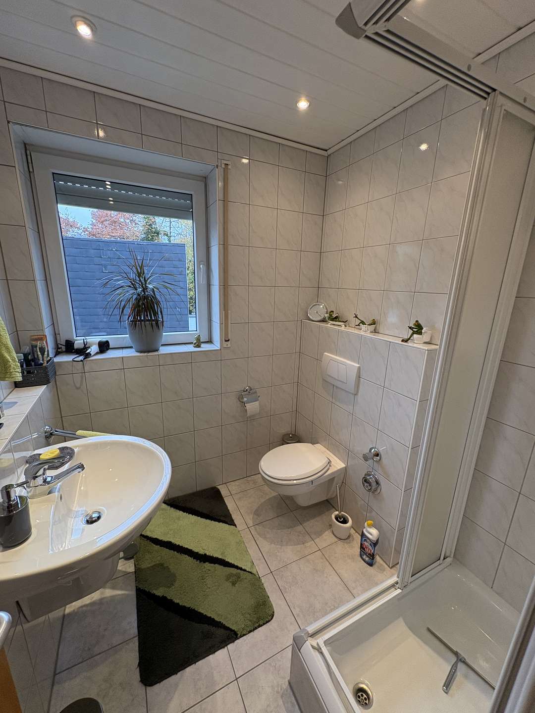 Die Wohnung ist mit Laminat- und Fliesenböden ausgestattet, die Türen sind in Buche Natur gehalten, und die Fliesen in Küche und Bad sind in weiß gestaltet. Die Fenster verfügen über Rollläden, und die Fensterbänke sind aus Marmor. Der Balkon ist mit Marlux-Platten versehen und bietet ausreichend Platz für eine kleine Sitzgruppe.