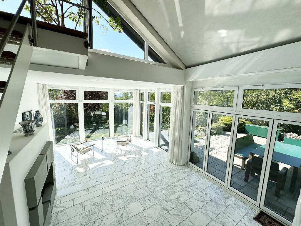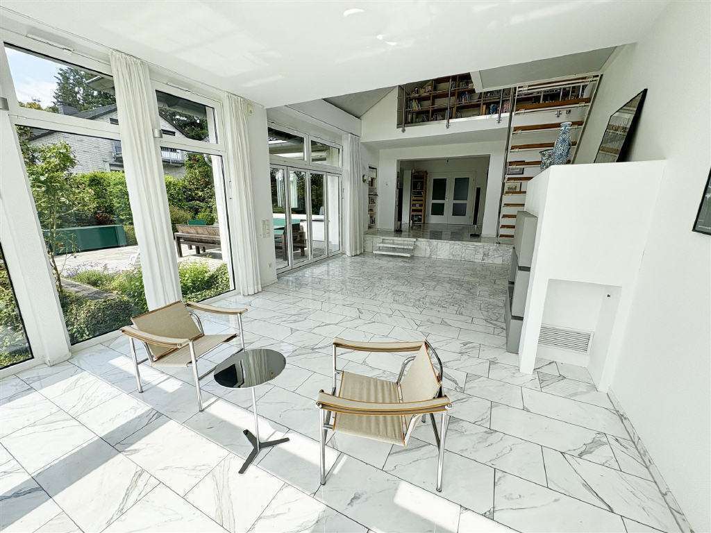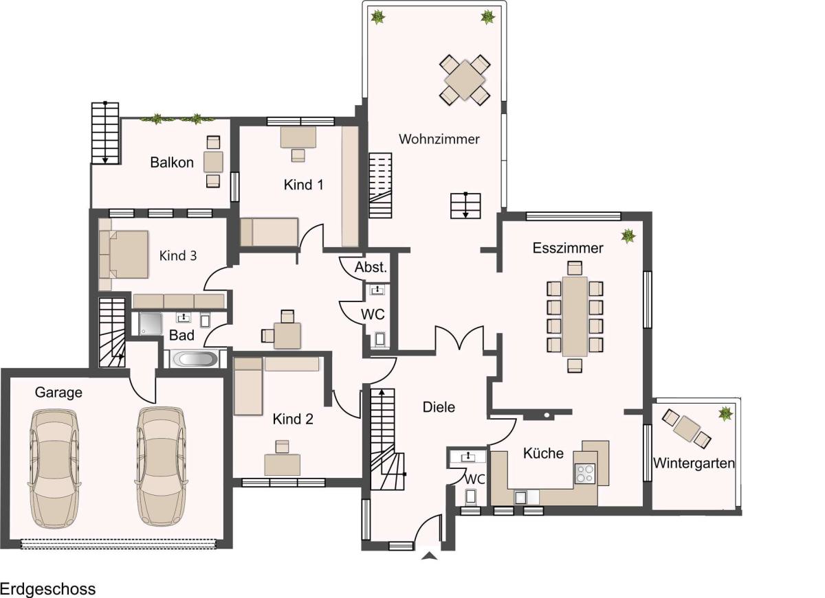Besonders hervorzuheben sind die gute Raumaufteilung im Erdgeschoss (Aufteilung in zwei Trakte) und die geschmackvolle und hochwertige Ausstattung. Die sinnvolle Erweiterung der Küche durch den Wintergarten sowie der Wohnzimmeranbau haben nicht nur für eine Vergrößerung des Wohnbereiches sondern auch für eine deutliche Aufwertung des Innenbereiches auf der Erdgeschoss-Ebene gesorgt. Die Galerie im Wohnzimmeranbau trägt zu einem sehr angenehmen Raumgefühl bei und lädt zum Verweilen ein. Der separate Kindertrakt auf der Erdgeschoss-Ebene mit drei Kinderzimmern, WC und Badezimmer bietet ideale Möglichkeiten für eine große Familie.