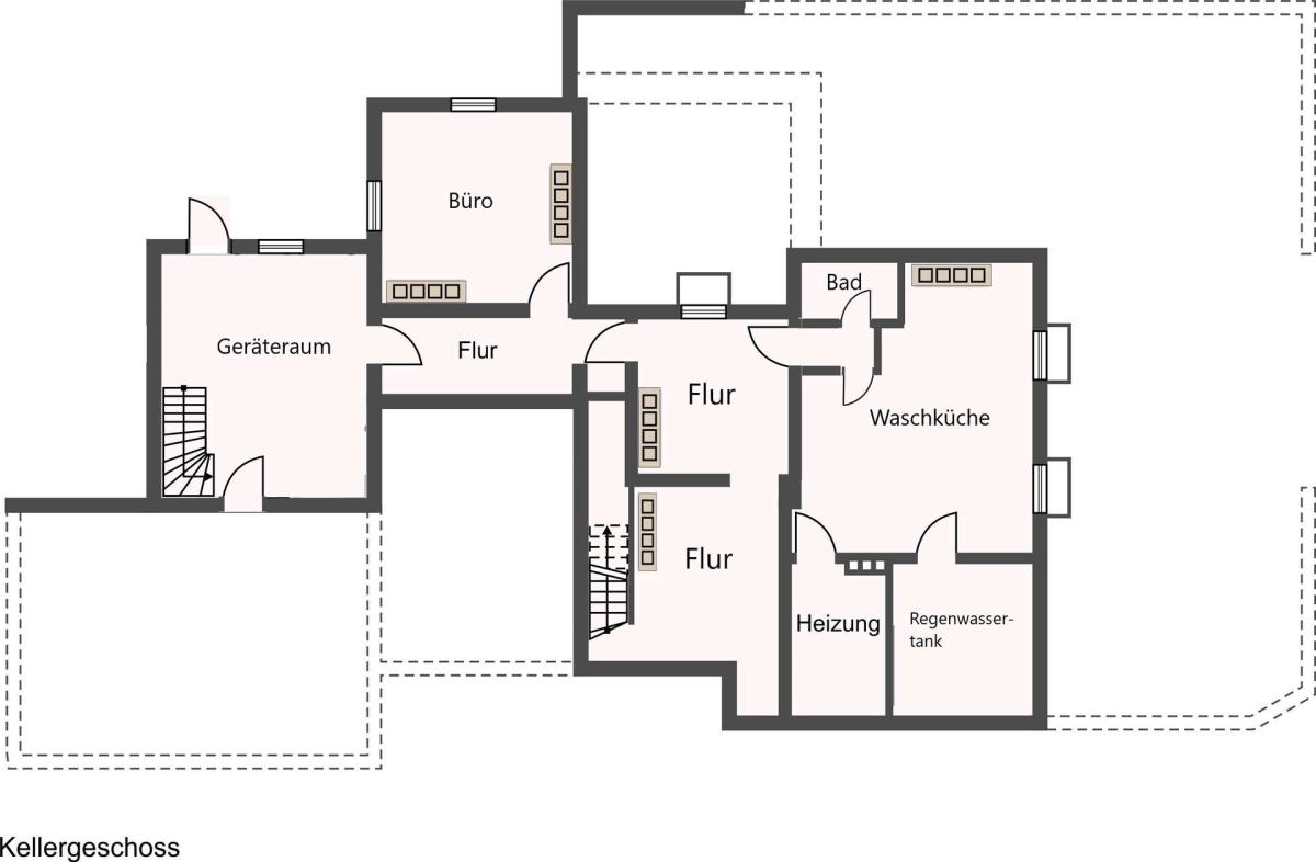 Das Kellergeschoss bietet ausreichend zusätzliche Nutzfläche und beinhaltet den Waschkeller, den Heizungsraum, einen Raum für den Regenwassertank, Abstellmöglichkeiten auf den Fluren und Vorräumen, ein Gäste WC mit Dusche sowie ein Gästezimmer mit Ausgang in den Garten. Des Weiteren gelangen Sie über einen Geräteraum sowohl in die Garage als auch in den Garten.