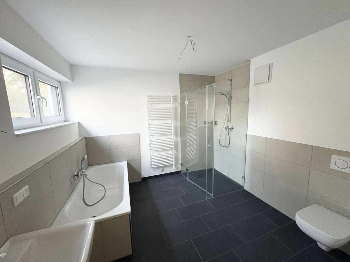 Das Tageslichtbad ist mit modernen Fliesen, einer Dusche sowie einer Badewanne ausgestattet – ideal für alle, die sowohl Komfort als auch elegante Ausstattung wünschen.