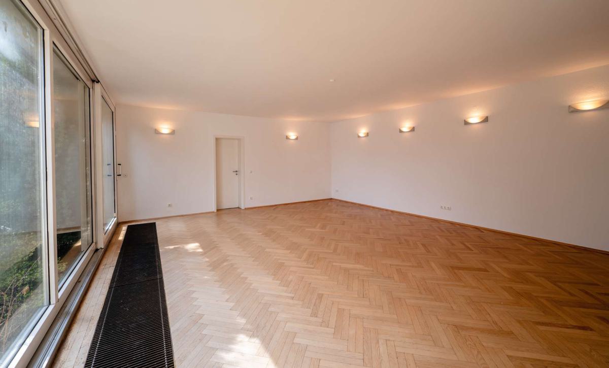 Das Erdgeschoss ist hauptsächlich als Arztpraxis mit ca. 170 m² konzipiert und vermietet, während das Untergeschoss vollständig unterkellert ist und über mehrere Kellerräume, einen Heizungskeller sowie einen Trockenraum verfügt. Die Ausstattung umfasst Kunststoff-Isolierfenster mit elektrischen Rollläden sowie Stein- und Parkettböden in den Gemeinschaftsbereichen. Die Praxisflächen selbst sind mit pflegeleichten PVC-Böden ausgestattet. Im hinteren Bereich sind Toiletten eingerichtet.