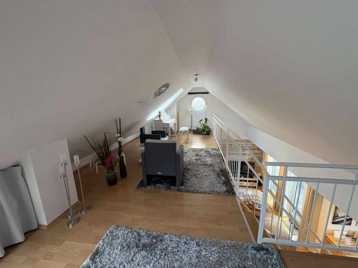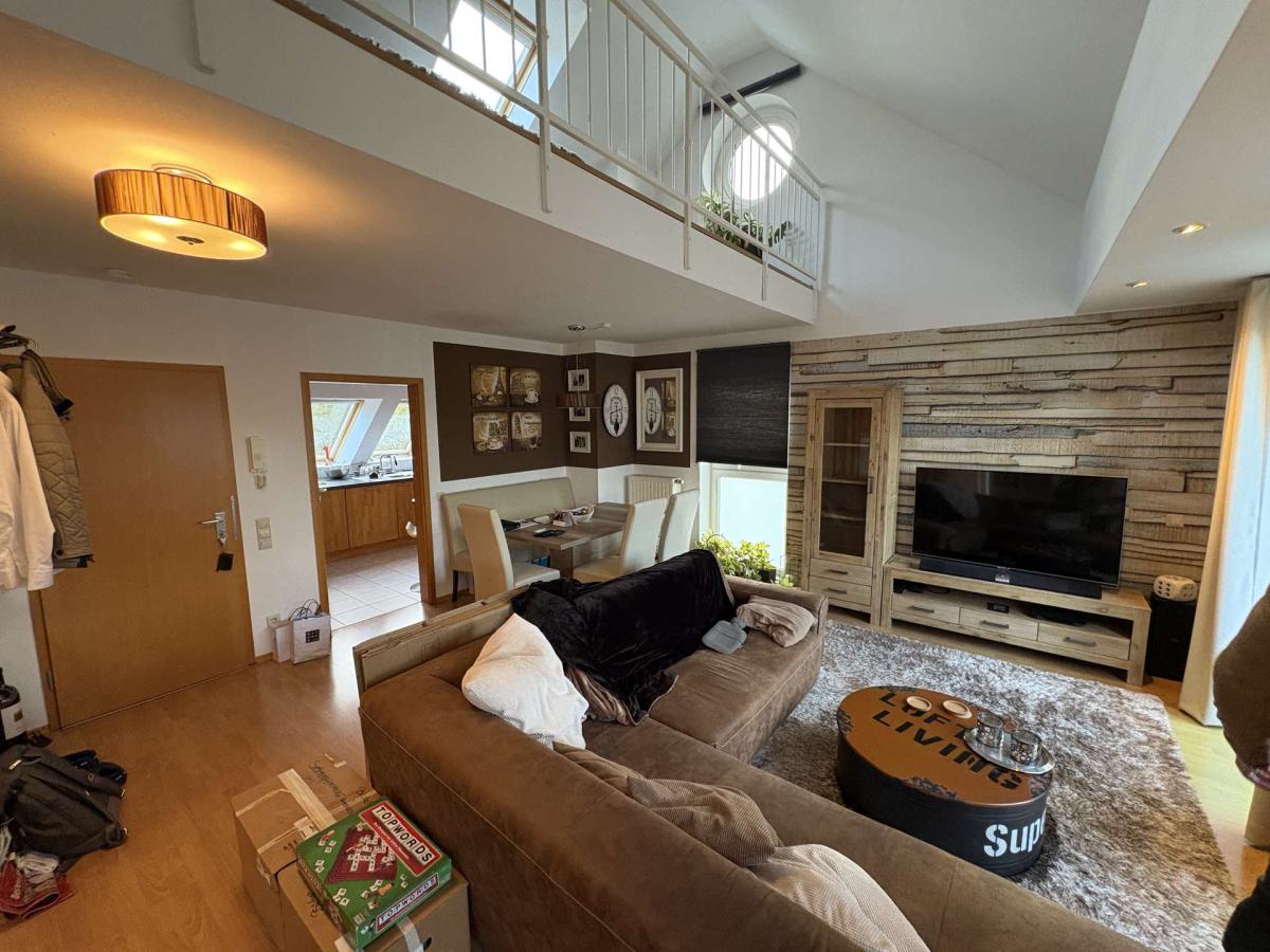 Die Wohnung besticht durch einen hellen Laminatboden in Buche im Wohnbereich, während Küche und Bäder in klassischen weißen Fliesen gehalten sind. Die Fenster sind mit Rollläden ausgestattet, und die Türen präsentieren sich ebenfalls in Buche-Optik. Das Wohnzimmer verfügt über eine Treppe, die zur Galerie im Spitzboden führt.