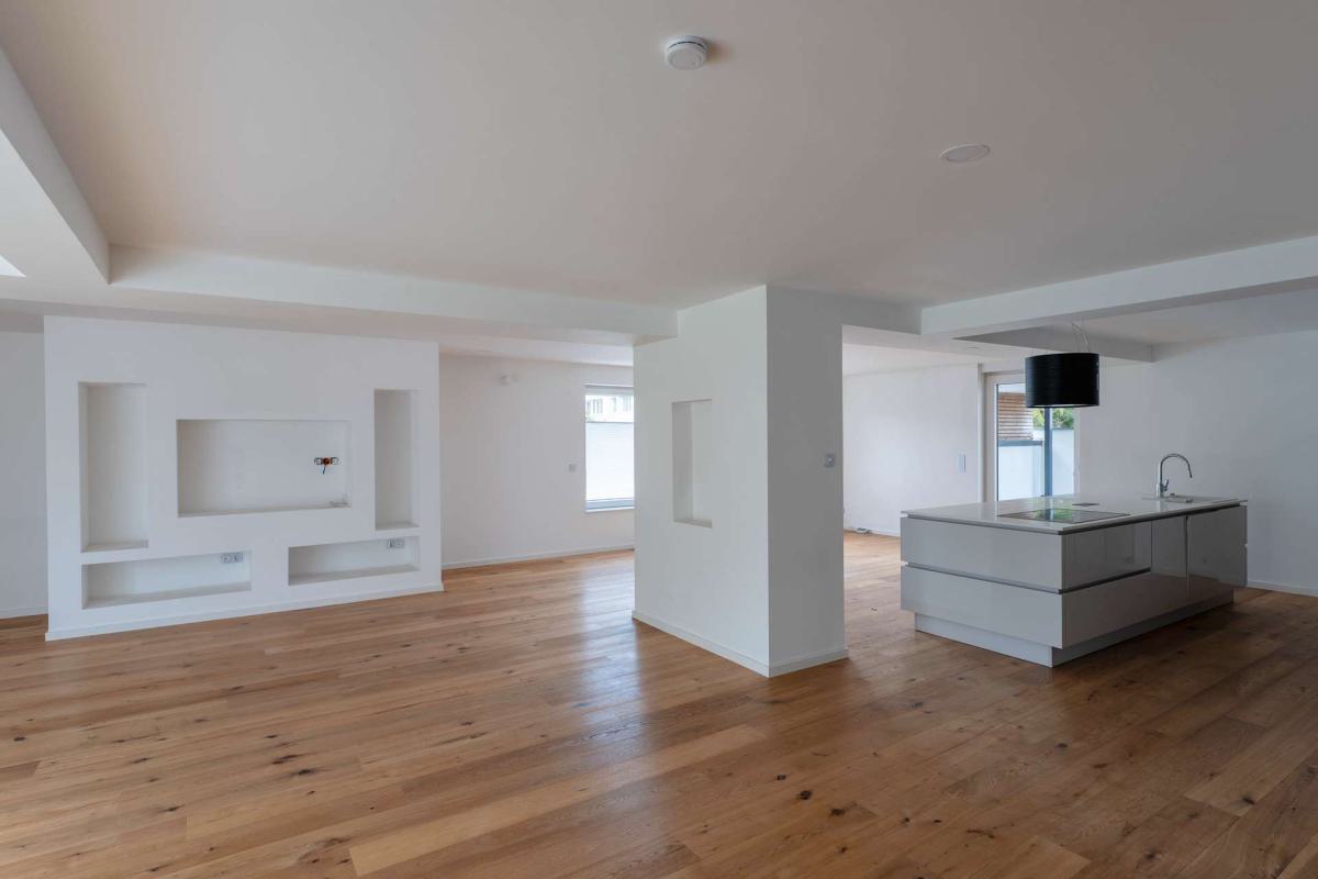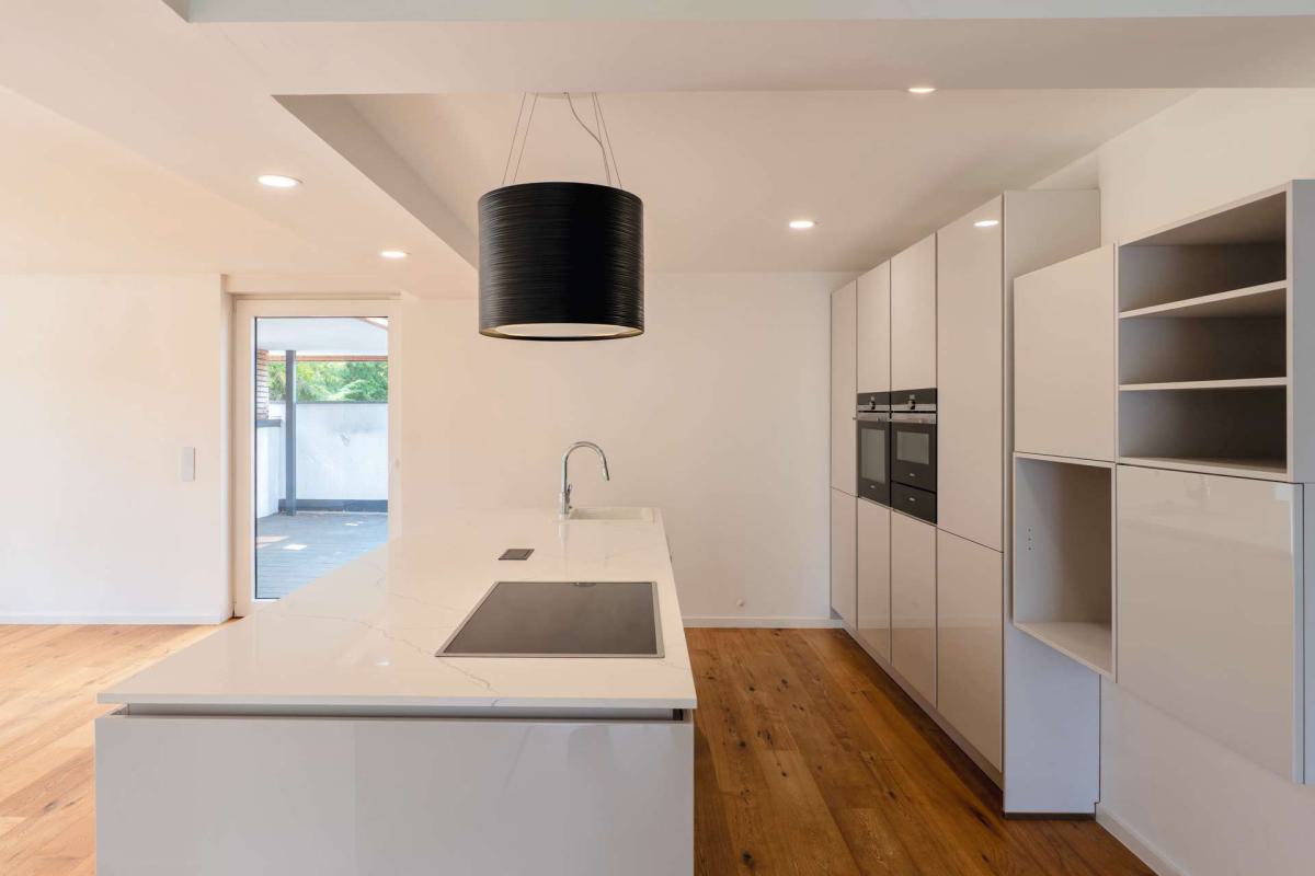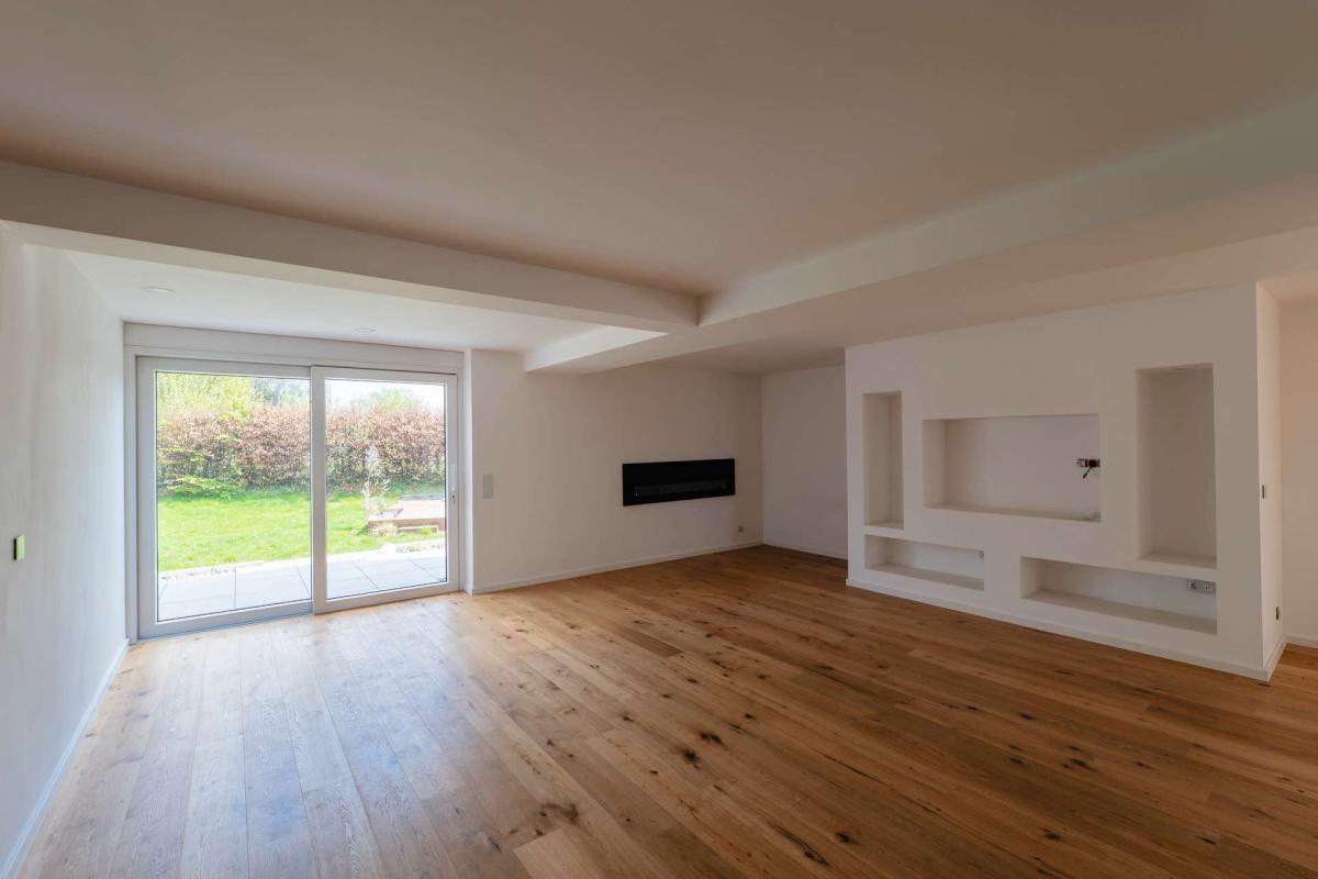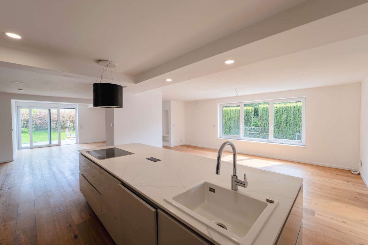 Das Erdgeschoss bietet mit großen Fensterfronten einen großzügigen, hellen und offenen Wohn-/Essbereich und einen direkten Blick und Zugang in den Garten. Die angrenzende offene Einbauküche mit Kochinsel lässt mit ihrer hochwertigen Ausstattung keine Wünsche offen. Außerdem befindet sich auf dieser Etage ein modernes Gäste-WC und ein Büro oder Gästezimmer.