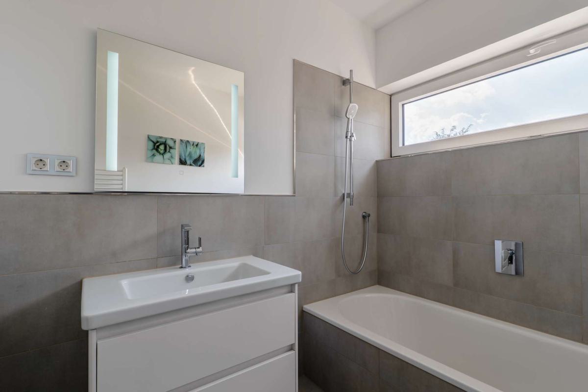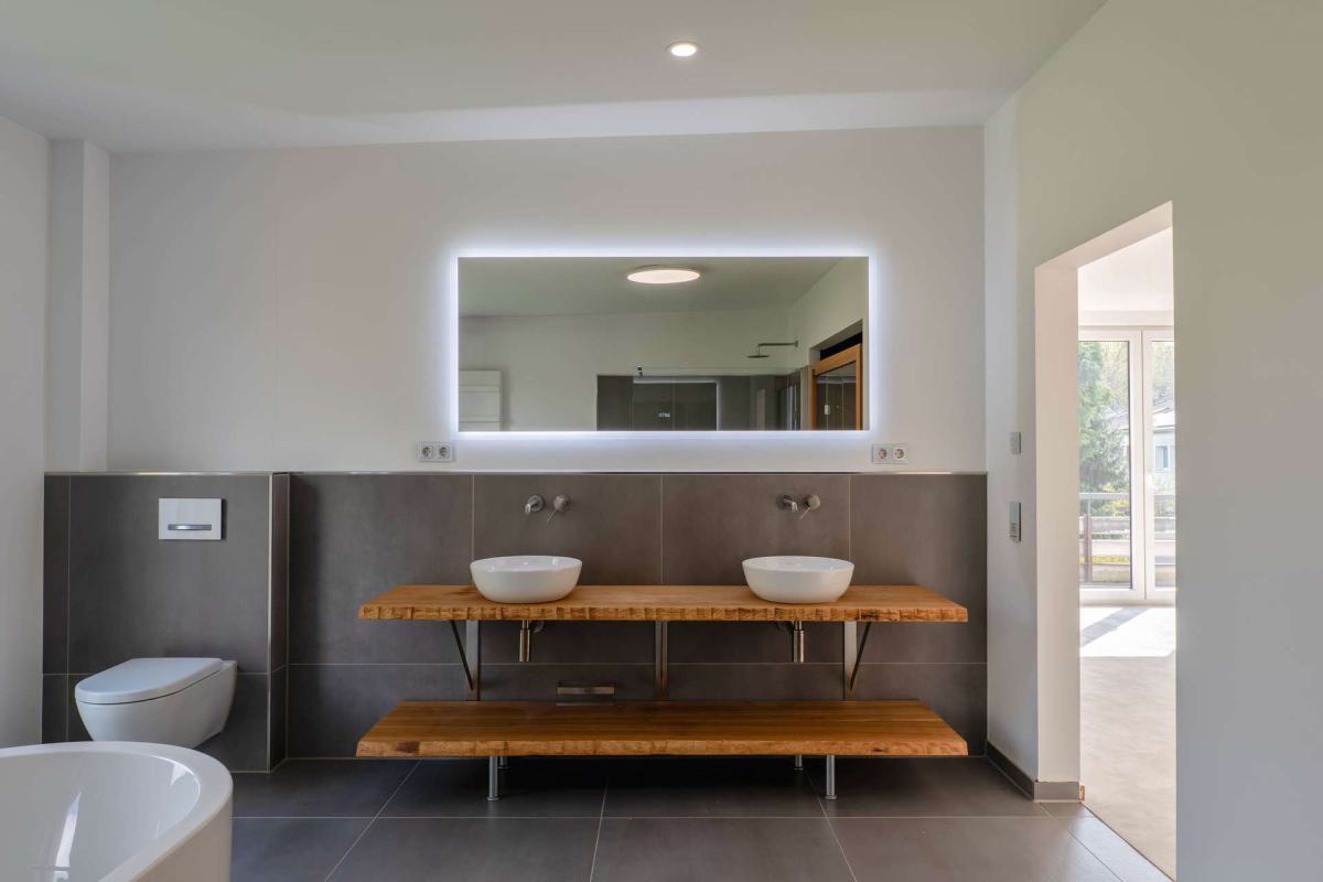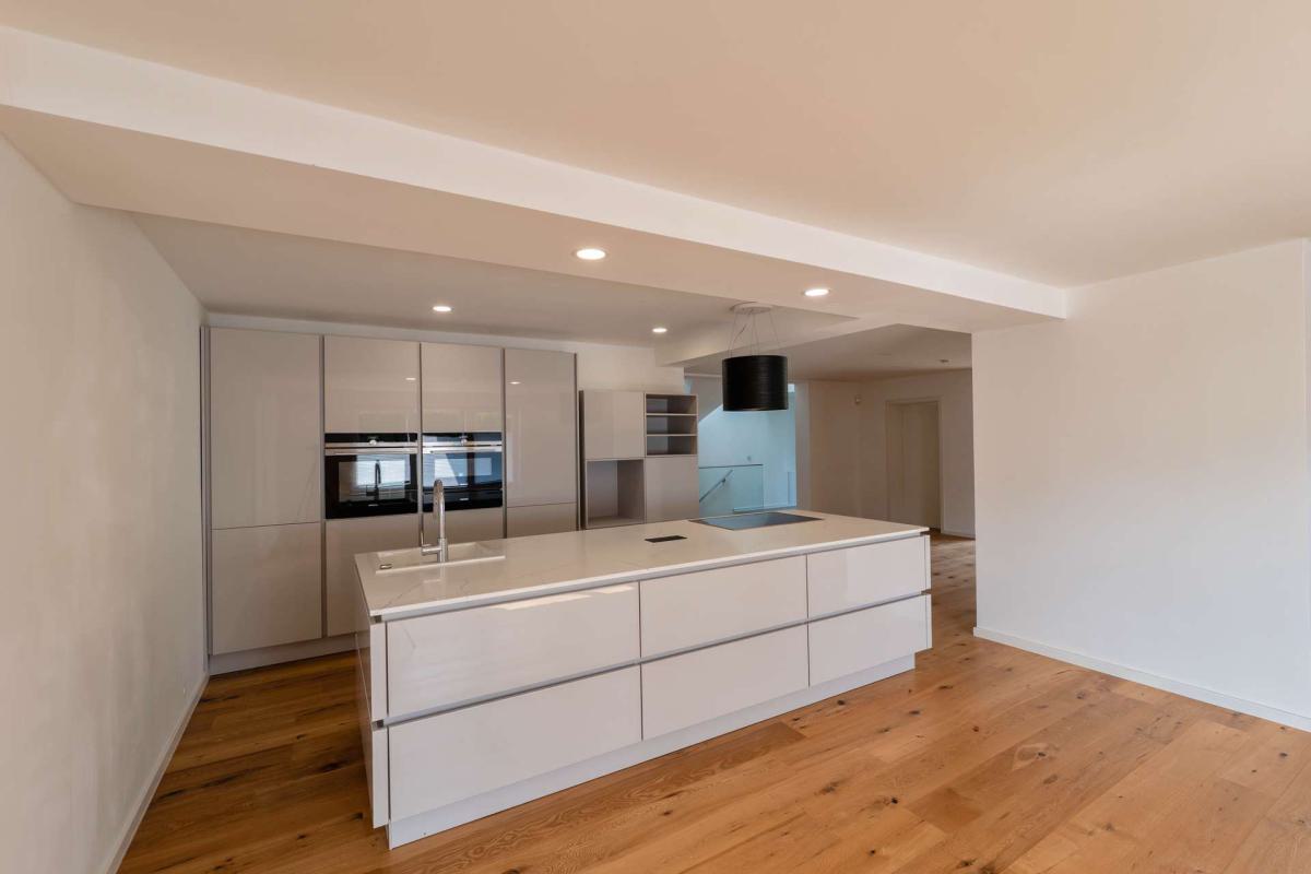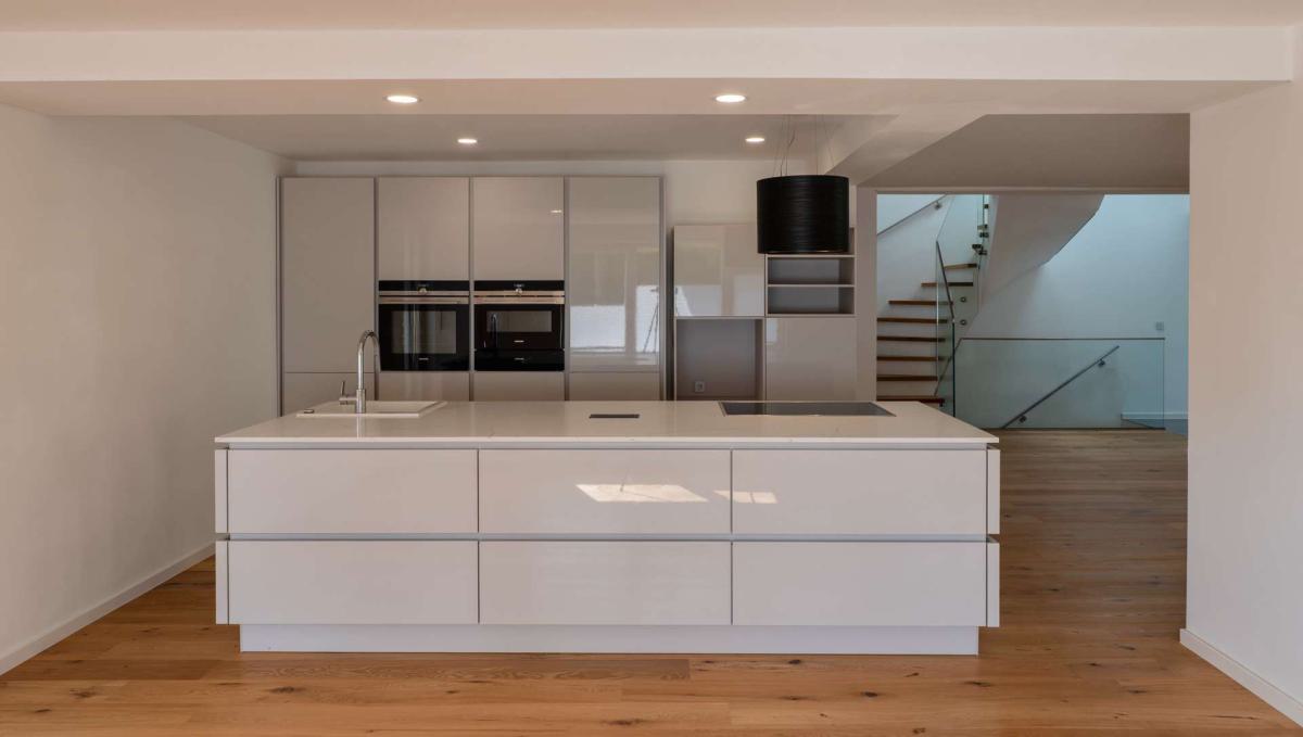 Das Erdgeschoss bietet mit großen Fensterfronten einen großzügigen, hellen und offenen Wohn-/Essbereich und einen direkten Blick und Zugang in den Garten. Die angrenzende offene Einbauküche mit Kochinsel lässt mit ihrer hochwertigen Ausstattung keine Wünsche offen. Außerdem befindet sich auf dieser Etage ein modernes Gäste-WC und ein Büro oder Gästezimmer.
