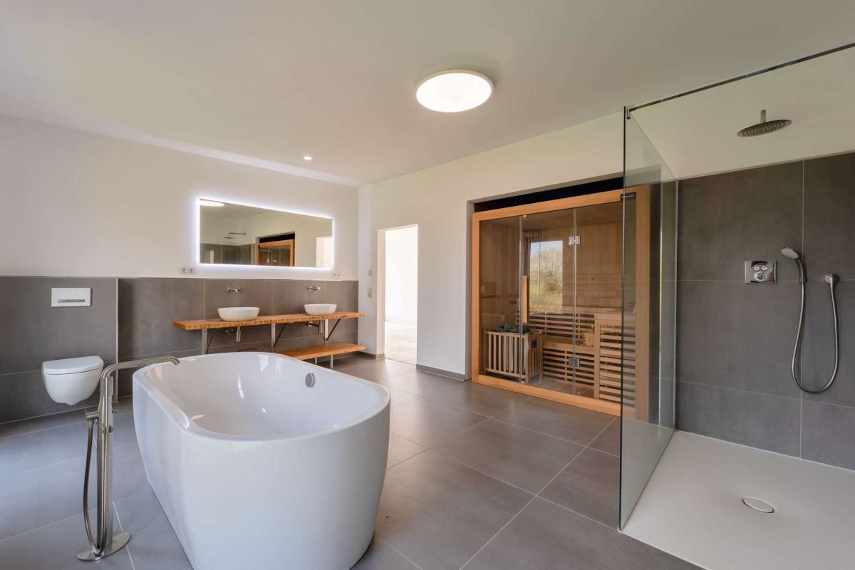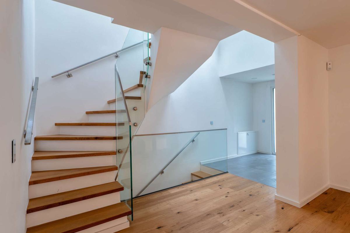 Über eine massive Treppe mit Holzbelag und elegantem Glasgeländer erreichen Sie das Dachgeschoss. Das Elternschlafzimmer mit Bad-en-Suite inklusive freistehender Badewanne, bodentiefen Fenstern, Sauna und Dusche und einem Ankleidezimmer sowie 2 Kinderzimmer und ein weiteres Tageslichtbad mit Dusche befinden sich auf dieser Ebene.
