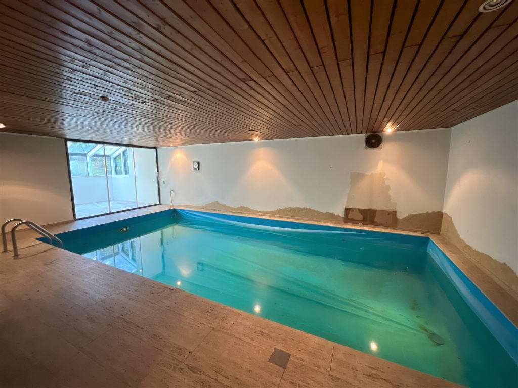 Im Untergeschoss des Einfamilienhauses befindet sich der Wellnessbereich mit einer Größe von ca. 72 m². Zum Wellnessbereich gehören ein Schwimmbad mit Austritt zum Garten, Sauna, Duschbereich, WC und ein Umkleidebereich. Zum Untergeschoss gehört außerdem ein Barbereich mit offenem Kamin und einer Größe von ca. 27 m².
