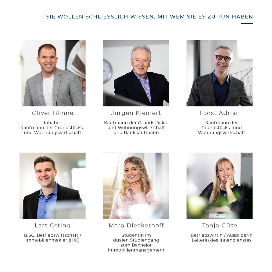 Unser Team besteht aus sechs bestens ausgebildeten Immobilienexperten – entweder als IHK-geprüfte Kaufleute der Grundstücks- und Wohnungswirtschaft oder in Ausbildung zum Bachelor of Arts im Bereich Immobilienmanagement. Mit unseren werblichen und verkäuferischen Aktivitäten wollen und werden wir auch Ihren Immobilienverkauf zu Ihrer vollsten Zufriedenheit erledigen.