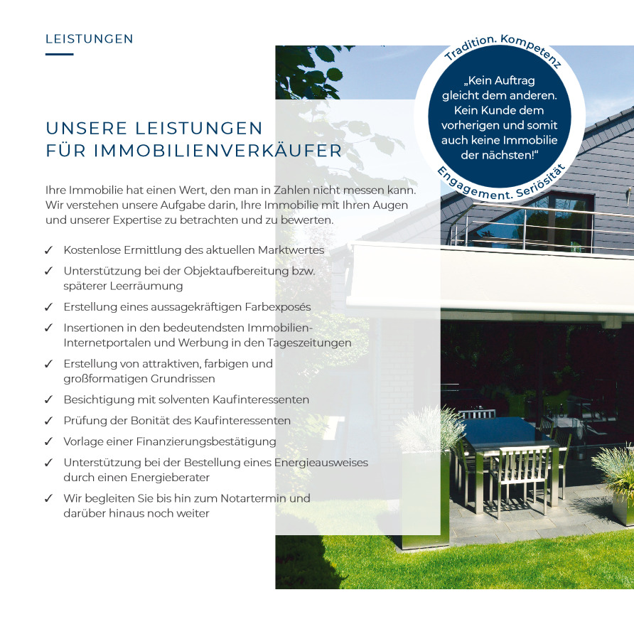 Unser Rund-Um-Service für Immobilienverkäufe umfasst die marktgerechte Bewertung des Objektes, die Erstellung eines professionellen und aussagekräftigen Verkaufsexposés, gezielte großformatige Werbung sowie Durchführung von Besichtigungen nur mit solventen Kaufinteressenten. Selbstverständlich bieten wir Ihre Immobilie auch im Internet an. Wir erledigen für Sie alle Vertragsverhandlungen und die Abwicklung sämtlicher Formalitäten bis zur Kaufvertragsbeurkundung.